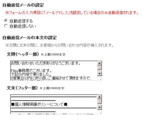 エンドユーザーが問い合わせをした後の返信メールについて、内容を設定できます。