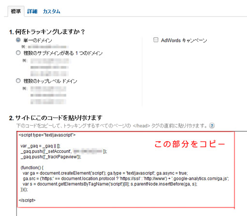 Analyticsにログイン後、右側の「アナリティクス設定」→ページ内の「トラッキングコード」を選択。