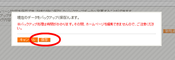 データのバックアップするかどうかの確認がでますので、「保存」をクリック。クリックするとバックアップが開始します。バックアップは、データの量によっては数分程度かかりますので、終了するまでお待ちください。