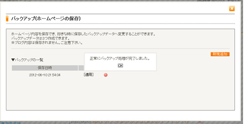 バックアップが完了すると、表示が出て完了となります。完了したら、バックアップの一覧部分に追加されます。