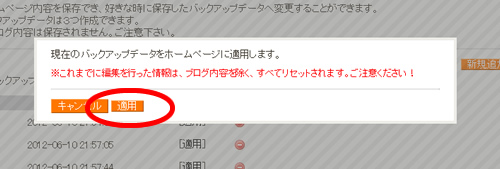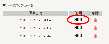 バックアップのデータに戻す時は、バックアップの一覧の「適用」をクリックします。